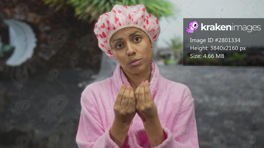 Woman gesturing money request outdoors wearing pink bathrobe and shower cap, suggesting humor and unexpected outdoor setting.