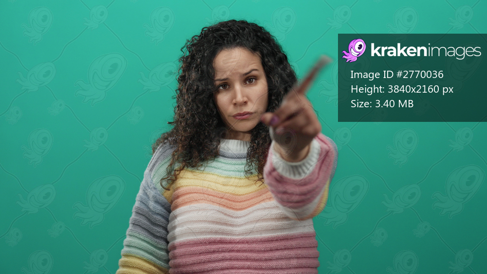 Woman gesturing no with hand towards camera against isolated green background, wearing colorful sweater, conveying rejection with serious expression.