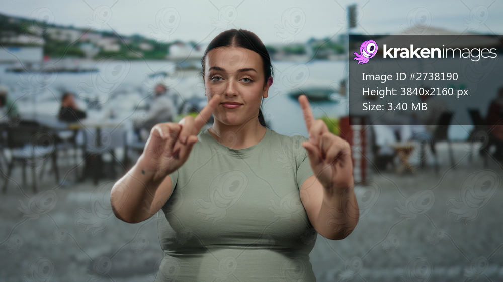 Woman gesturing no on terrace in outdoor restaurant with scenic background, wearing casual outfit, signaling disapproval as she stands among people enjoying coffee by the water. - Kraken Images