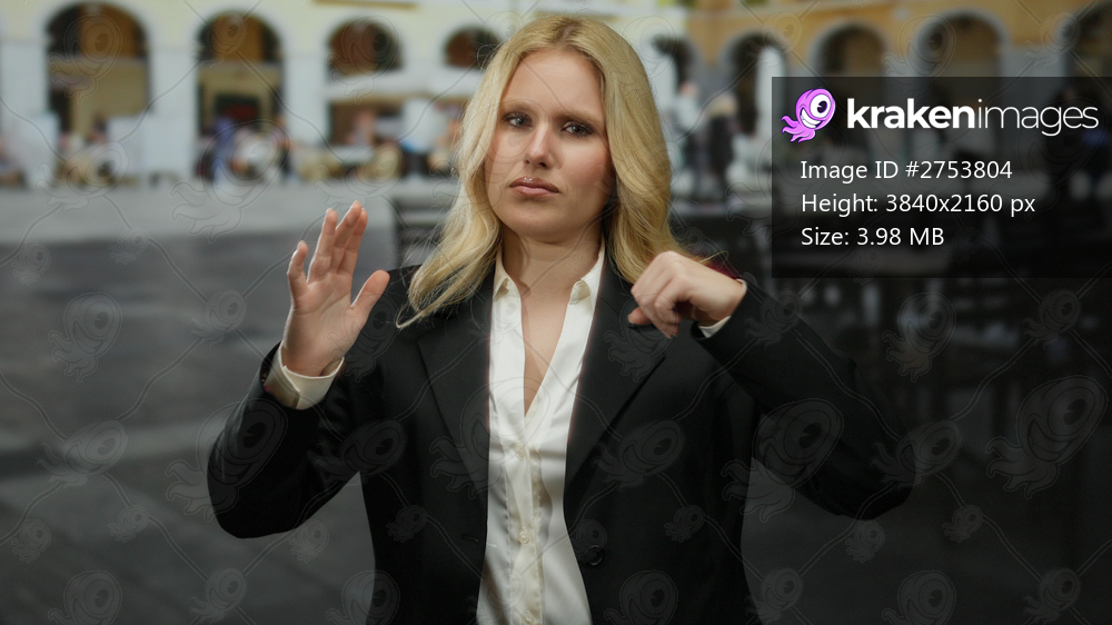 Woman gesturing on a bustling city street, depicting a serious expression while communicating something important in an urban outdoor environment.