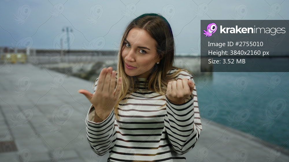 Woman gesturing on a seaside promenade with inviting expressions, blonde hair, and striped shirt, showcasing a playful mood by the beach under an overcast sky. - Kraken Images