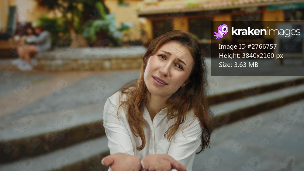Woman gesturing on city street, expressing emotion in casual clothing with urban background, capturing candid moment outdoors near steps in city setting. - Kraken Images