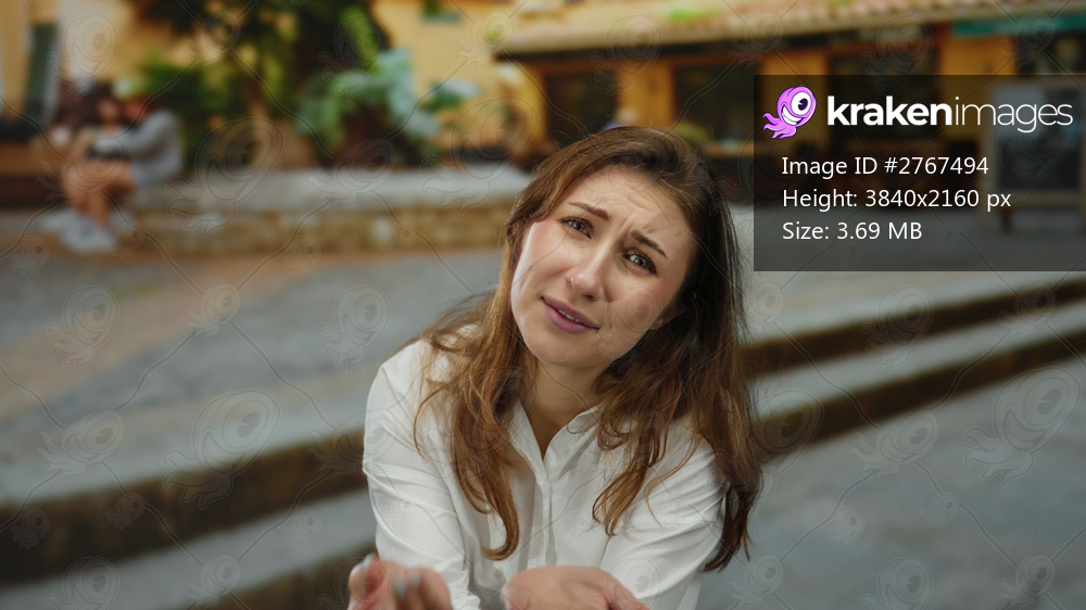 Woman gesturing on city street, expressing emotion in casual clothing with urban background, capturing candid moment outdoors near steps in city setting. - Kraken Images