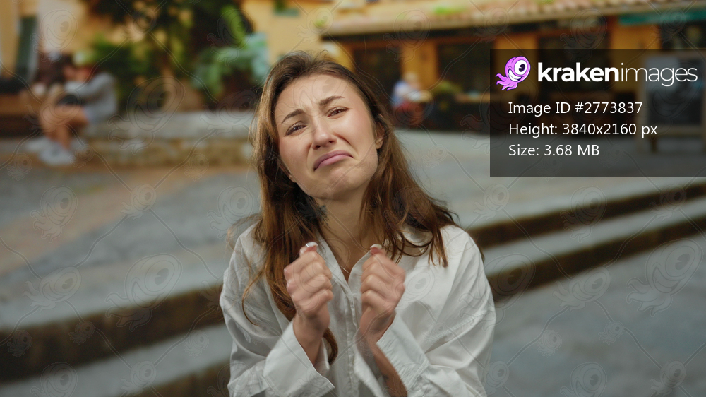 Woman gesturing on city street, expressing emotion in casual clothing with urban background, capturing candid moment outdoors near steps in city setting. - Kraken Images