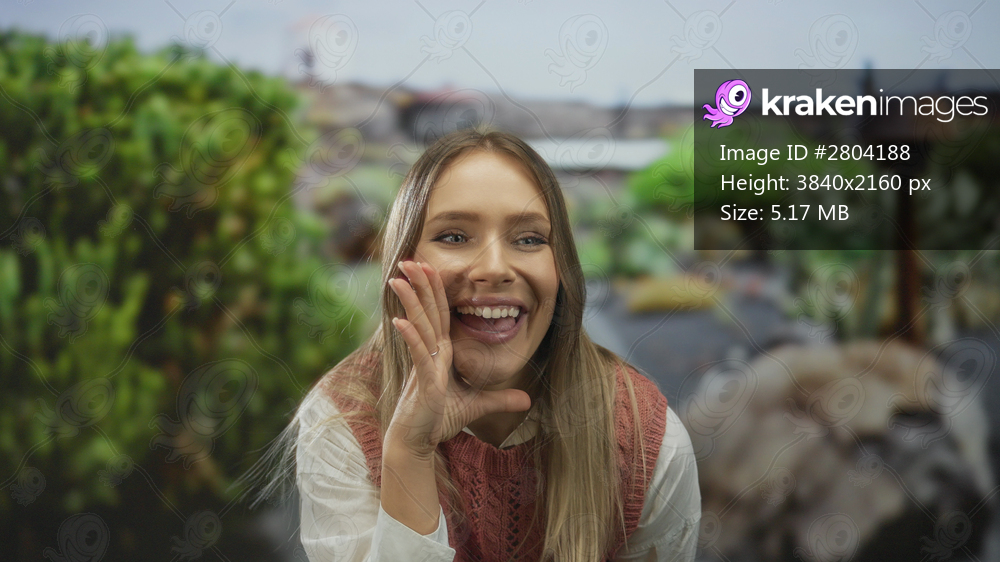 Woman gesturing on city street invites while smiling among greenery suggesting a warm and welcoming urban outdoor vibe.