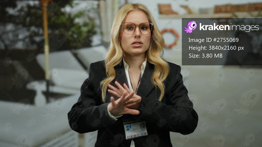 Woman gesturing on cruise ship deck with identification badge, blonde hair, professional attire, expressing emotions amid luxurious surroundings, enhancing visual storytelling.