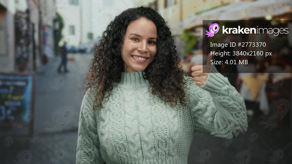 Woman gesturing on outdoor terrace with curly hair wearing sweater expressing emotions on street surrounded by cafes and people in the background during daytime. - Kraken Images