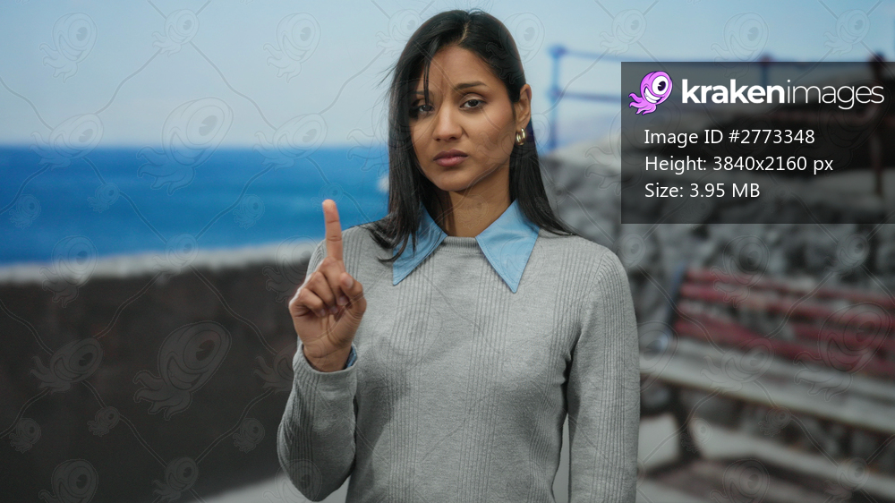 Woman gesturing on seaside promenade with ocean background, indicating no with finger, young latin, wearing grey sweater, beach setting creating a relaxed outdoor atmosphere. - Kraken Images