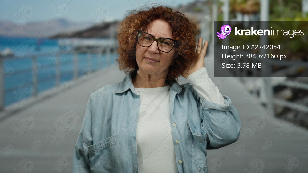 Woman gesturing on seaside promenade with ocean and mountains in the background, wearing glasses and casual attire, displaying emotion in an outdoor setting. - Kraken Images