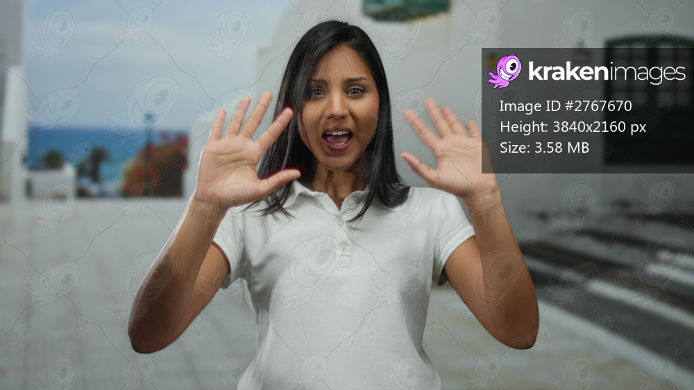 Woman gesturing on sunny street with bright blue ocean backdrop, cheerful vibe and casual attire highlighting latin charm and outdoor scenario.