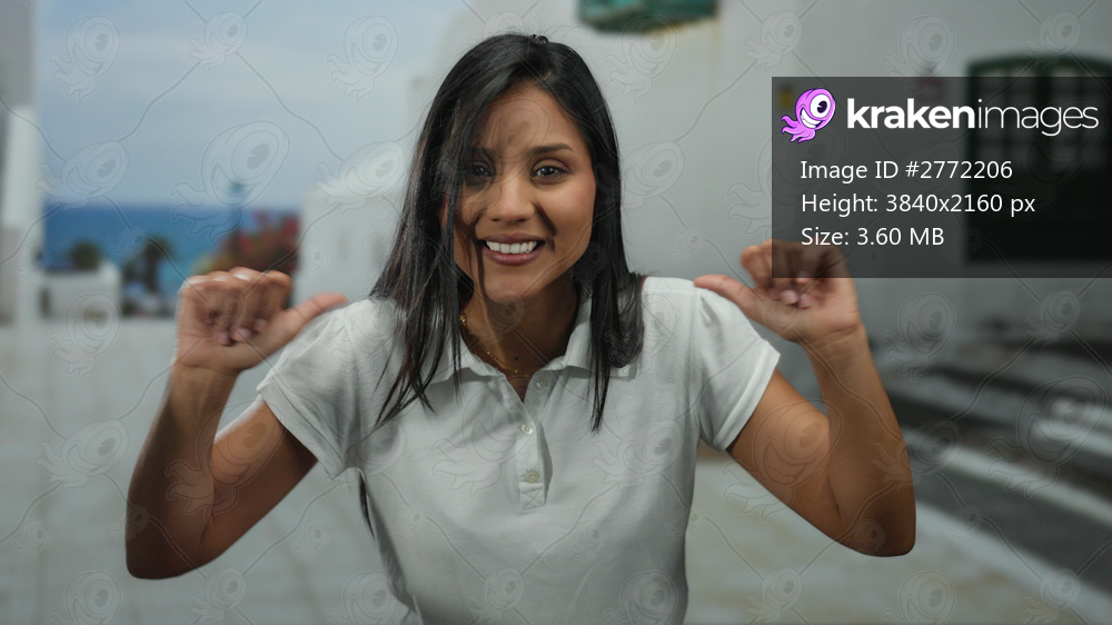 Woman gesturing on sunny street with bright blue ocean backdrop, cheerful vibe and casual attire highlighting latin charm and outdoor scenario.