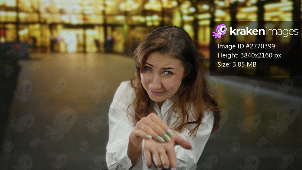 Woman gesturing on urban street at night in city scene with blurred background showcasing emotion and expression outdoors under bright lights.