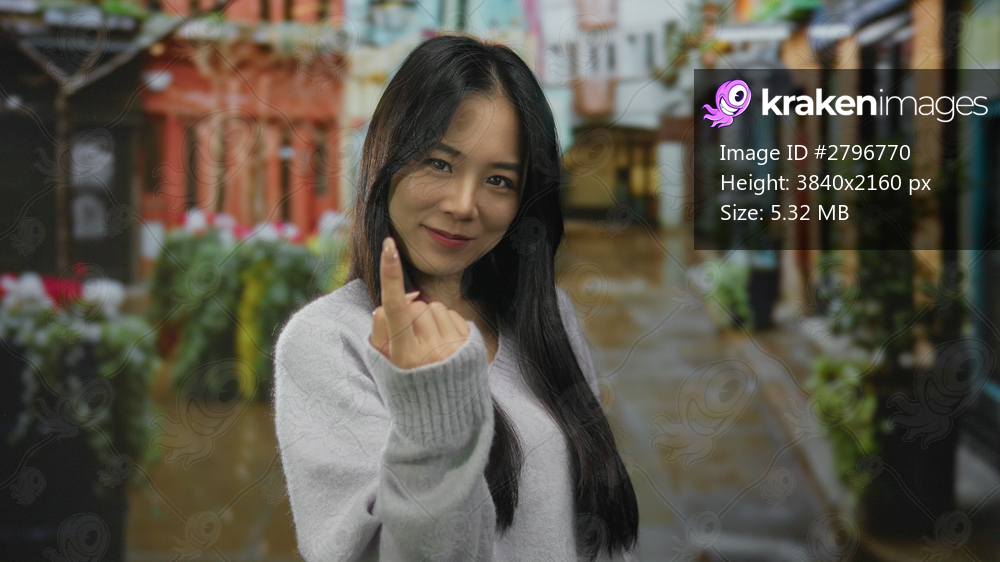 Woman gesturing on vibrant urban street in cozy sweater, inviting with smile, capturing playful and engaging moment outdoors, surrounded by colorful architecture and plants. - Kraken Images