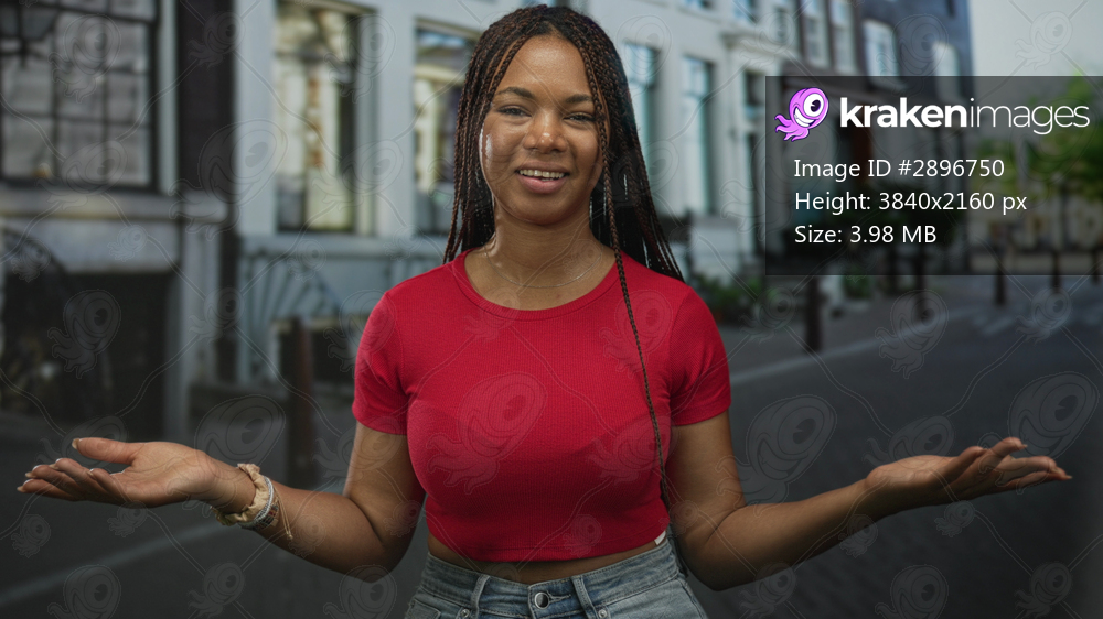 Woman gesturing with open hands on a street in front of row houses, wearing red crop top and jeans, braided hair visible; confidence openness.