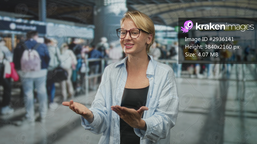 Woman gesturing with open hands and touching chest in busy airport terminal queue; reassurance communication.