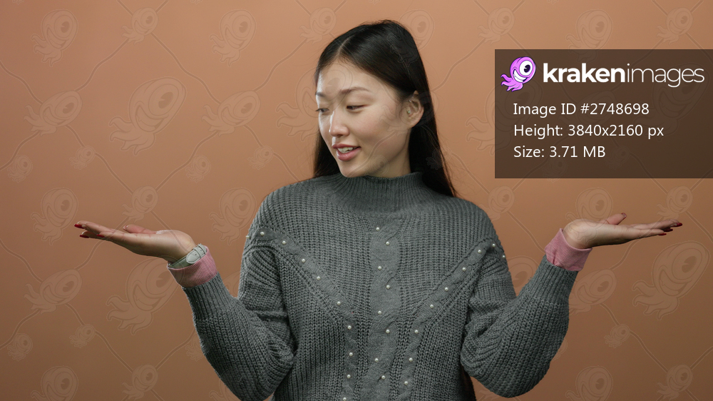 Woman gesturing with open palms against a brown wall, wearing a grey sweater, conveying choice or presentation with a calm expression.