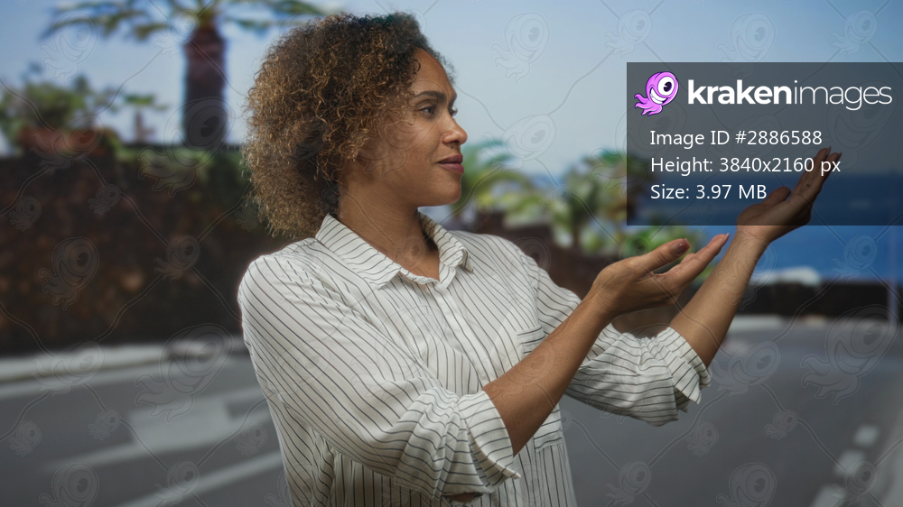 Woman gesturing with open palms on a coastal street beside palm trees and ocean; personal reflection calm insight.