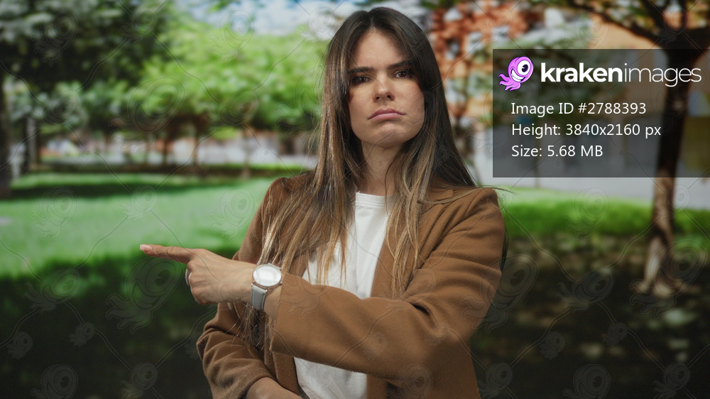 Woman gesturing outdoors in a green park setting, surrounded by trees, expressing with confident hand signs as sunlight filters through the foliage.