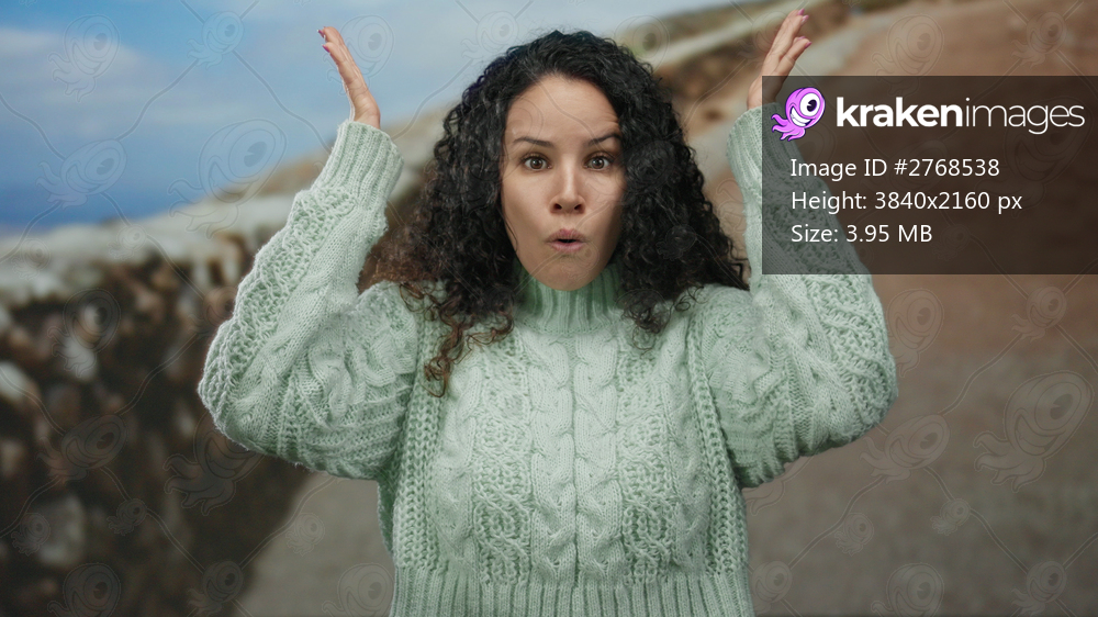 Woman gesturing outdoors on a street wearing a sweater against a rural background in daylight reflecting surprise and emotion.