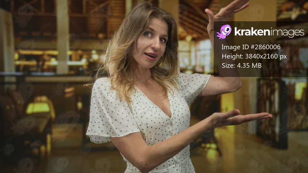 Woman gesturing with palms up and smiling, open hands visible in a hotel building lobby showing conversational pose and relaxed posture; welcome hospitality serenity. - Kraken Images