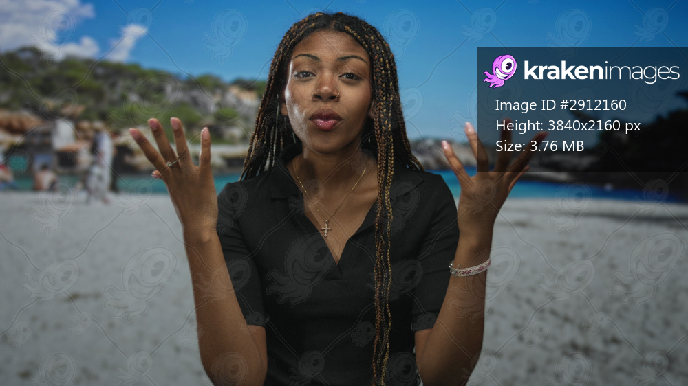 Woman gesturing palms up with visible face and braided hair on sandy beach in daylight; thoughtful conversation.