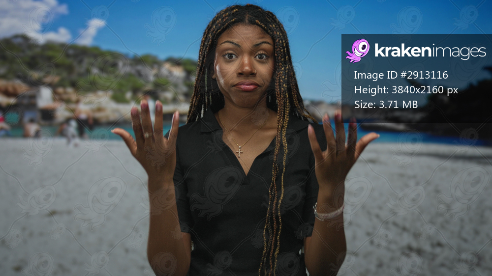 Woman gesturing palms up with visible face and braided hair on sandy beach in daylight; thoughtful conversation.