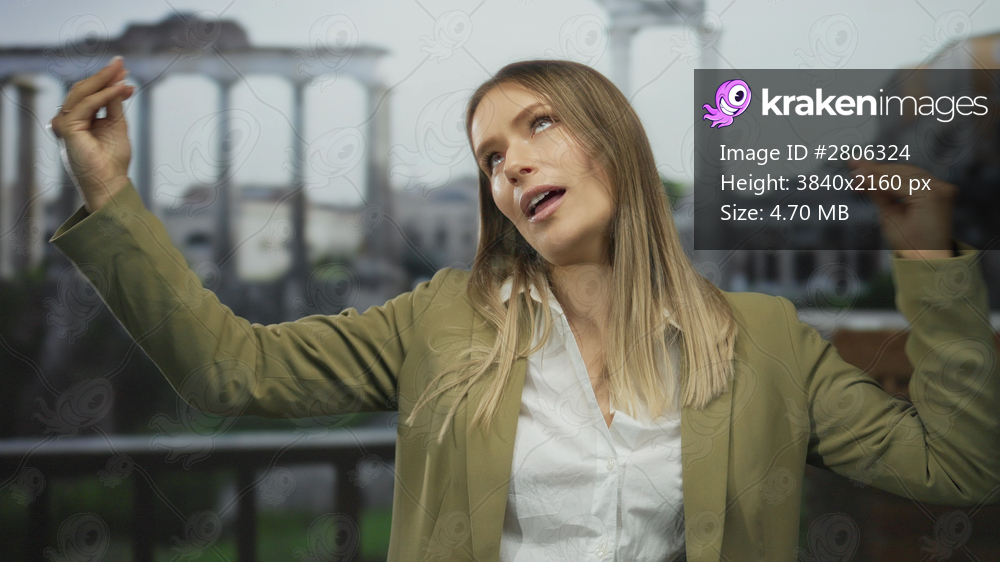 Woman gesturing passionately with hands in front of ancient roman ruins, showcasing a lively discussion amidst the historical backdrop of an outdoor city setting. - Kraken Images