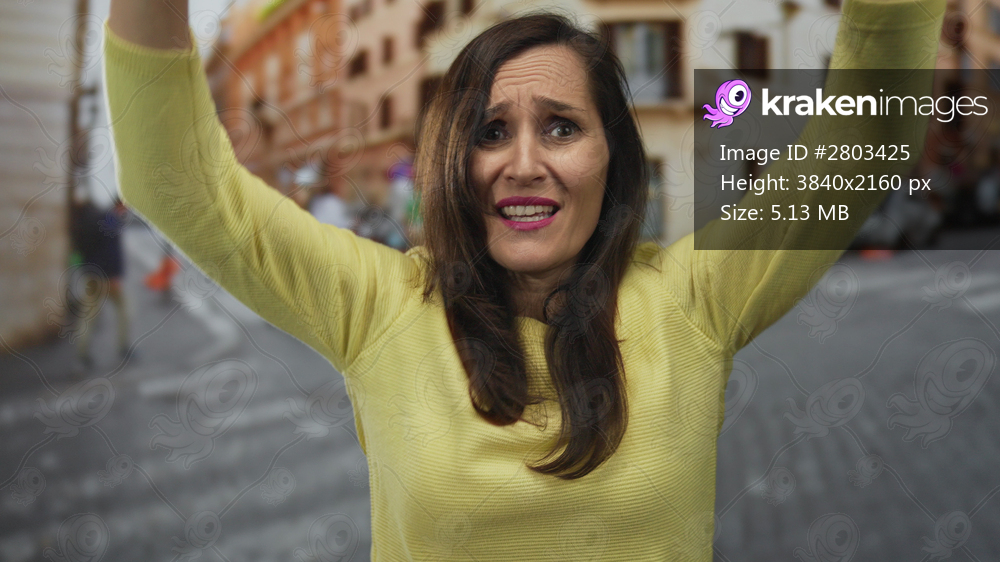Woman gesturing passionately on bustling street showing her vibrant personality and expressive emotion while surrounded by urban scenery and lively atmosphere. - Kraken Images