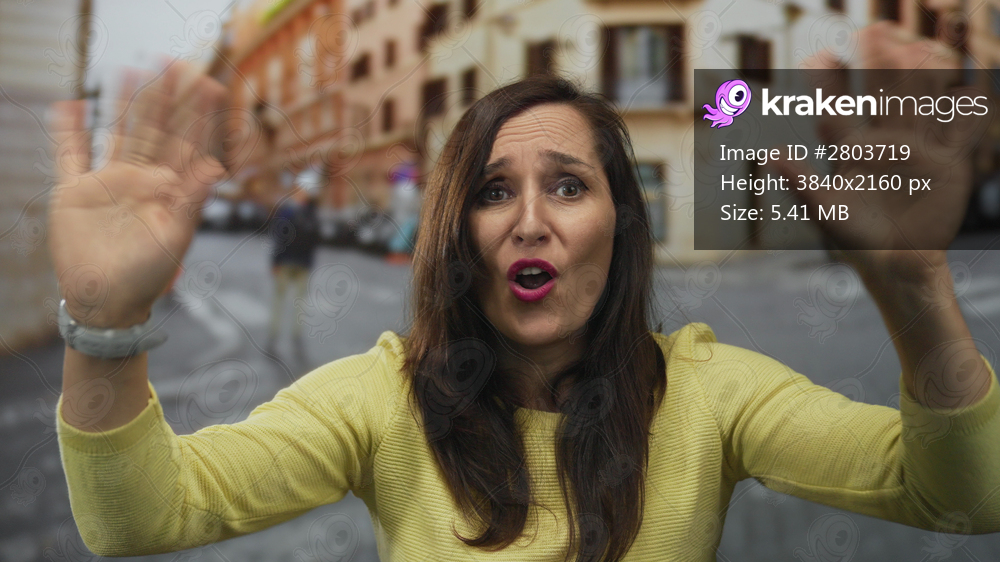 Woman gesturing passionately on bustling street showing her vibrant personality and expressive emotion while surrounded by urban scenery and lively atmosphere. - Kraken Images