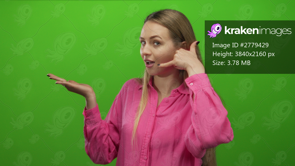 Woman gesturing phone call with hand over green background, showcasing open palm, wearing pink shirt.