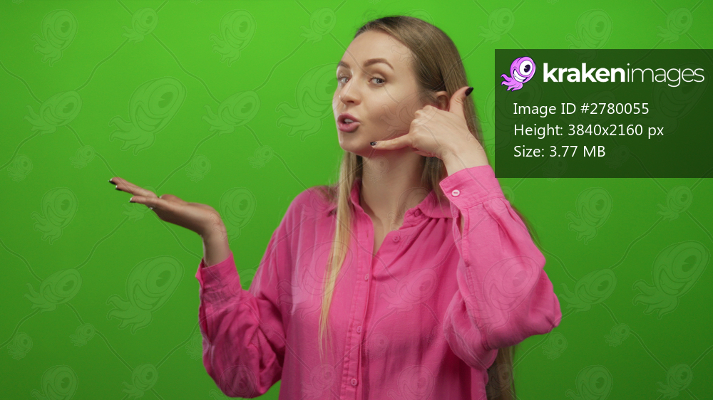 Woman gesturing phone call with hand over green background, showcasing open palm, wearing pink shirt.