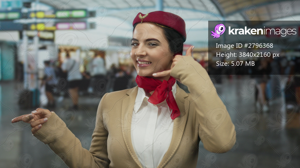 Woman gesturing phone call in airport, wearing flight attendant uniform with a red scarf, smiling and pointing directions, captures the essence of customer service and travel assistance. - Kraken Images