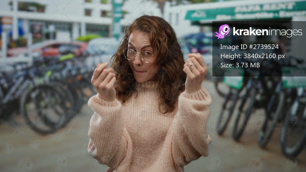 Woman gesturing playfully with a smile on a city street surrounded by rental bicycles creating a lively urban atmosphere.