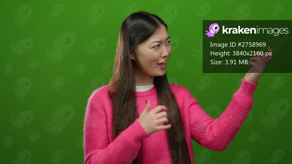 Woman gesturing playing guitar poses confidently in pink sweater against vibrant green background capturing joy and creativity