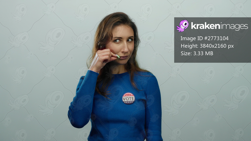 Woman gesturing silence with closed mouth and holding a key in front of isolated white background wearing a vote badge in a symbolic gesture of civic responsibility. - Kraken Images
