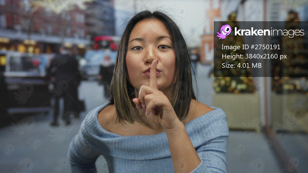 Woman gesturing silence on a city street adorned with festive decorations, embodying tranquility amidst urban hustle, capturing a thoughtful outdoor moment with a christmas atmosphere. - Kraken Images