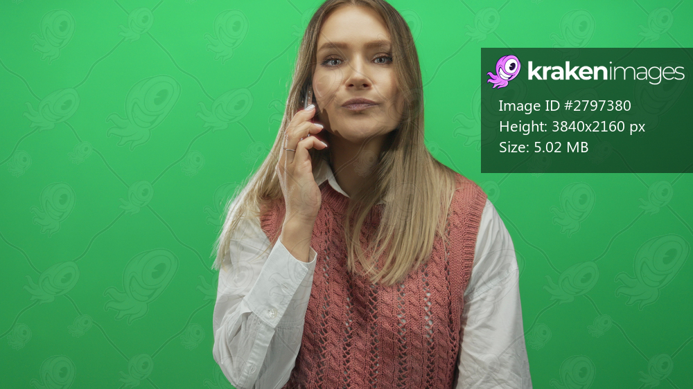 Woman gesturing silence while on phone against green isolated background wearing casual clothing and expressing emotions in a vibrant setting