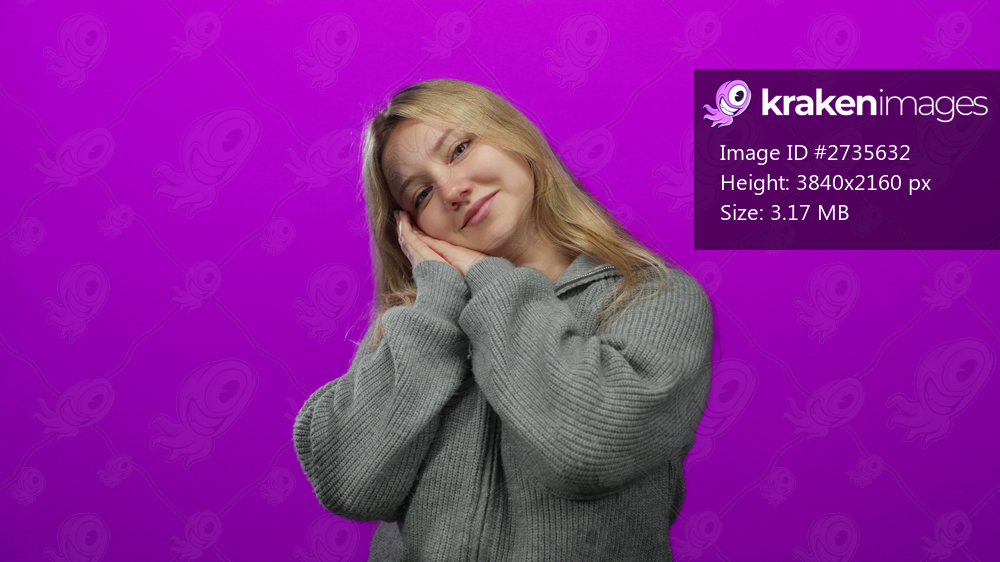 Woman gesturing sleep with closed eyes and hands under her cheek, wearing gray sweater against vibrant pink background, creating a cheerful and relaxed atmosphere. - Kraken Images