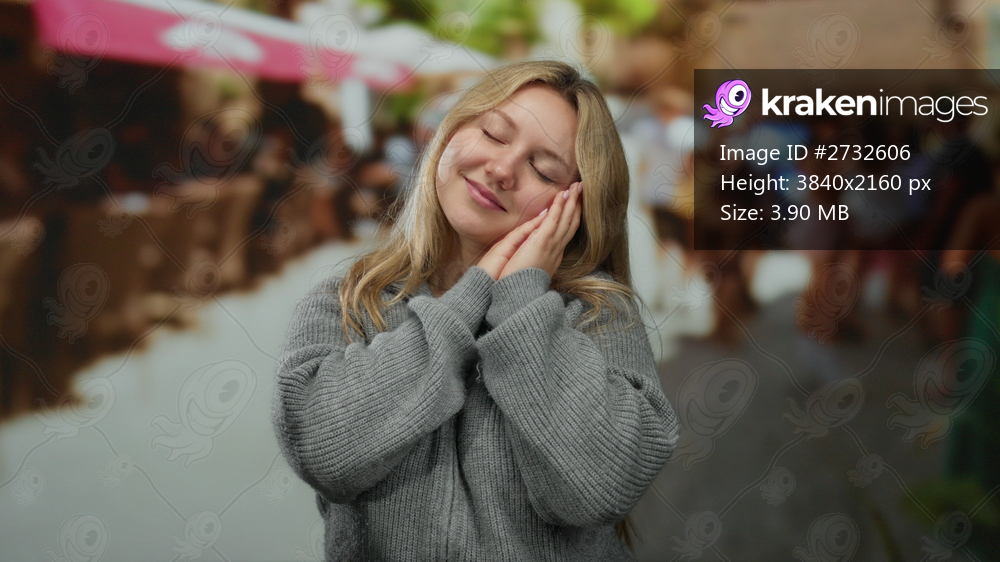 Woman gesturing sleep with hands in a lively city street, wearing a cozy sweater, blonde hair flowing, capturing an outdoor moment with a blurred background of people and cafes. - Kraken Images
