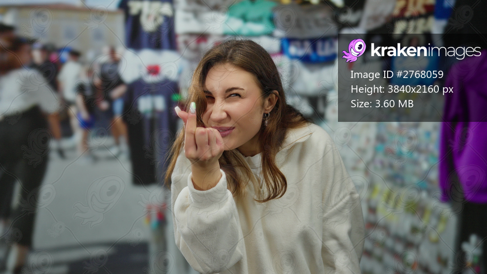 Woman gesturing small size with fingers at outdoor market with colorful clothing background in busy city street