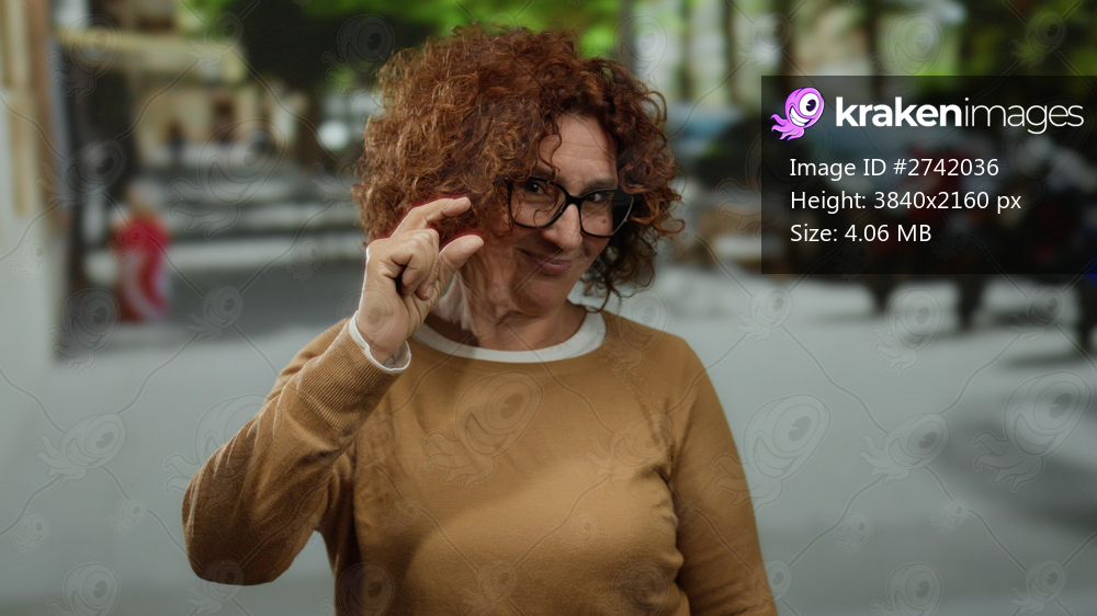Woman gesturing small size on urban street with trees and blurred background, wearing glasses and brown sweater, demonstrating concept in city environment. - Kraken Images