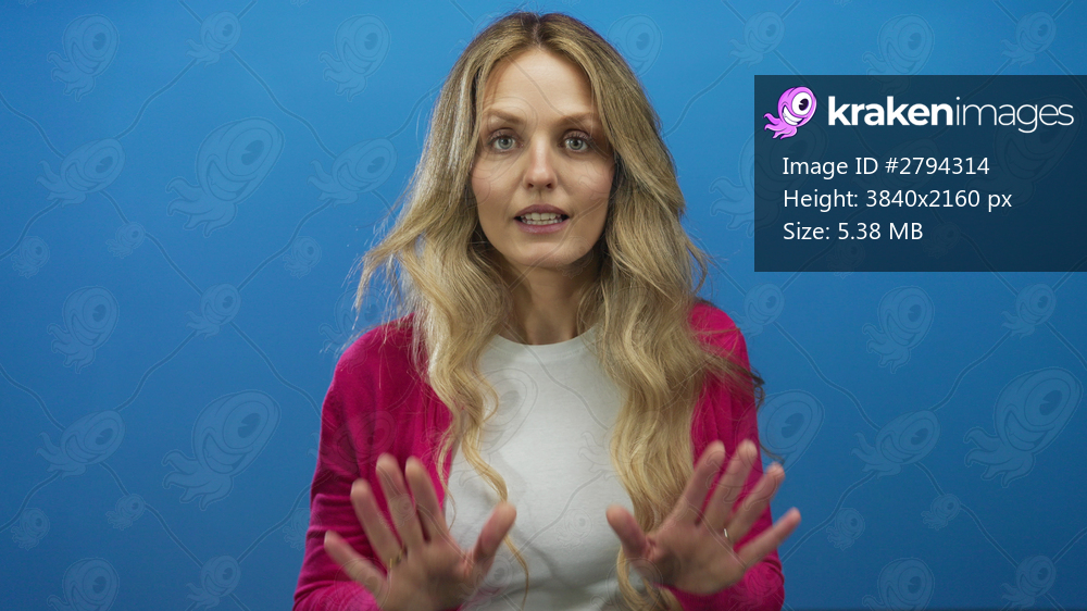 Woman gesturing stop with hands against a vivid blue background, wearing a pink sweater and white shirt, exuding calmness and focus in the isolated scene. - Kraken Images
