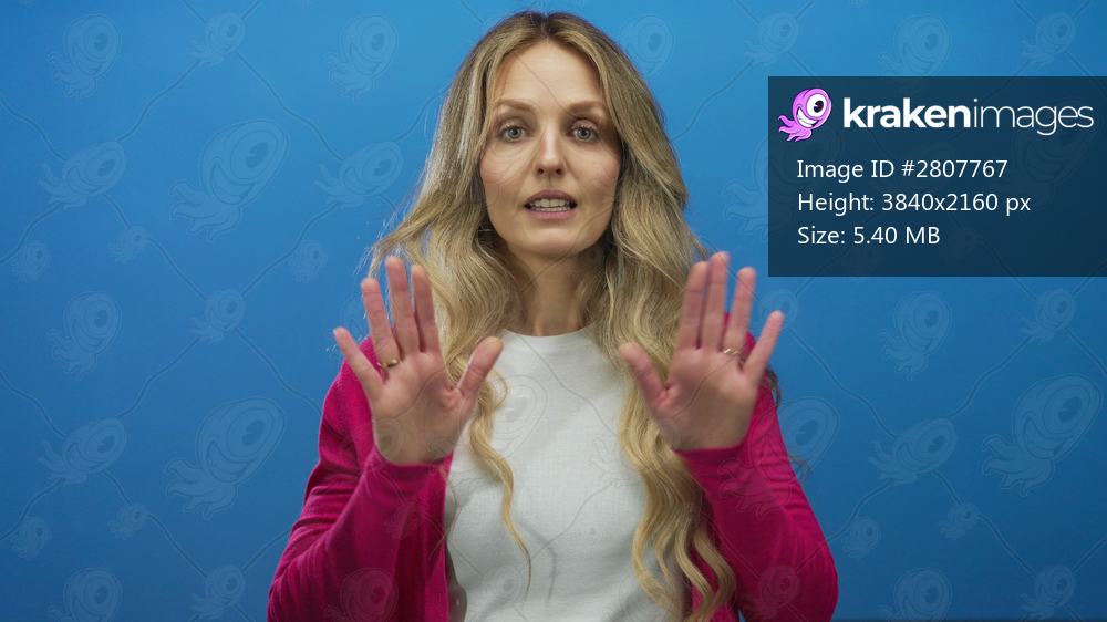 Woman gesturing stop with hands against a vivid blue background, wearing a pink sweater and white shirt, exuding calmness and focus in the isolated scene. - Kraken Images