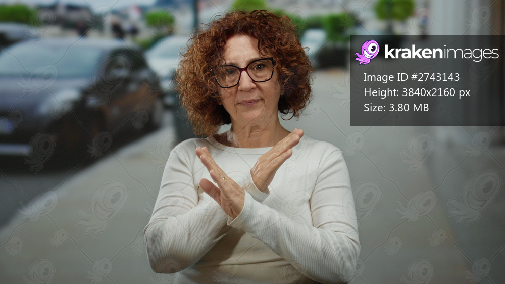 Woman gesturing stop with hands on a city street, middle-aged hispanic with glasses, wearing white shirt, outdoor urban setting, cars in background, emphasizing clear communication. - Kraken Images