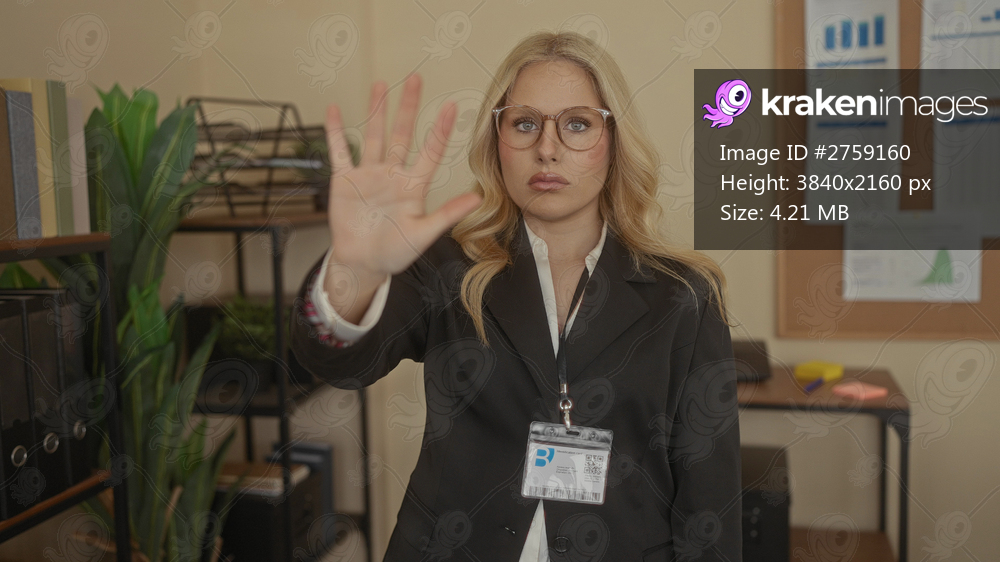 Woman gesturing stop in office wearing glasses and black suit with background charts on a bulletin board suggesting a professional environment indoors. - Kraken Images