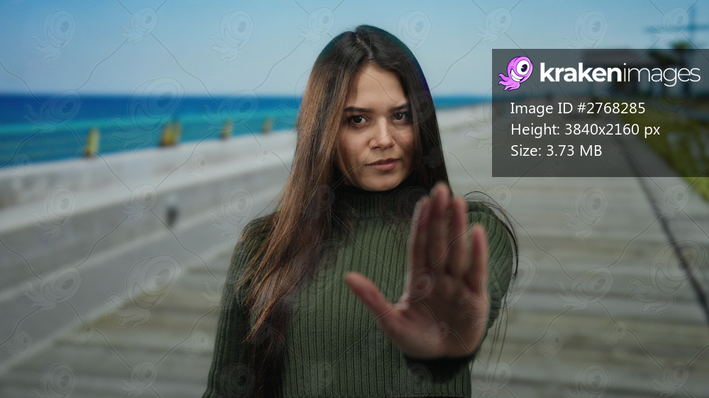 Woman gesturing stop on a sunny seaside promenade with the sea in the background showcasing her serious expression and long brown hair against a clear blue sky. - Kraken Images