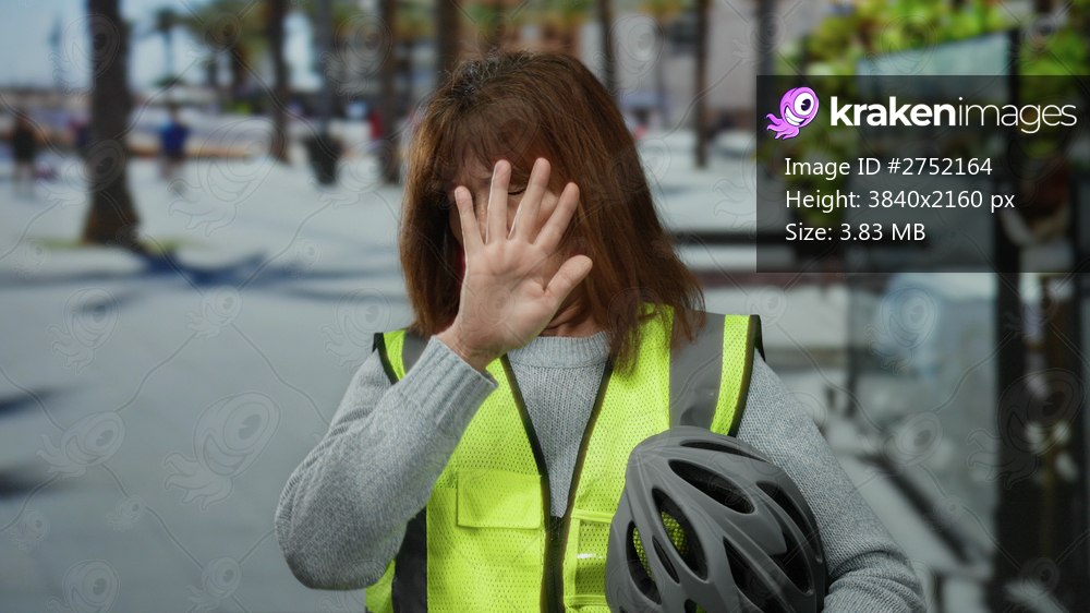 Woman gesturing stop wearing a neon vest on a vibrant city sidewalk, holding a bike helmet, with blurred palm trees and cafes in the sunny background.