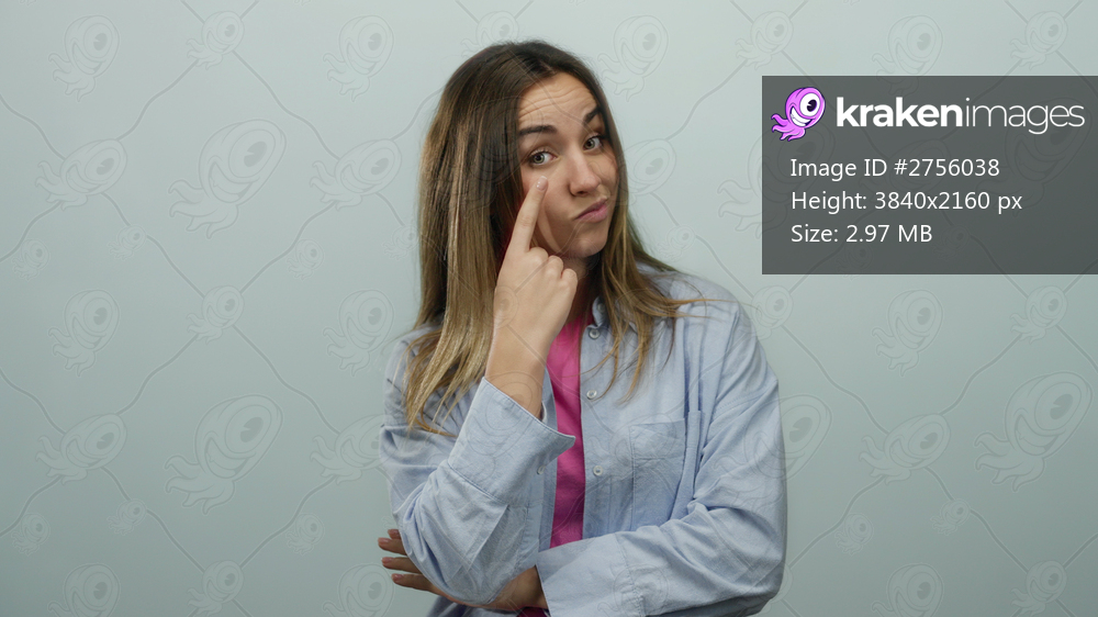 Woman gesturing thoughtfully with finger on face against isolated white background looking calm and confident wearing pink shirt under blue jacket conveying curiosity and insight - Kraken Images