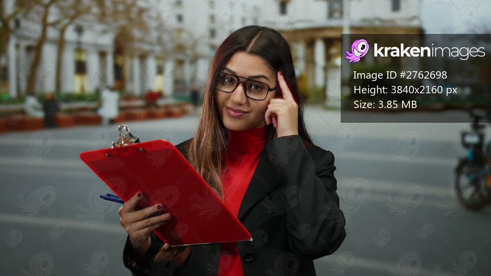 Woman gesturing thoughtfully holding clipboard in urban street setting wearing glasses and red top showcasing determination and focus outdoors.
