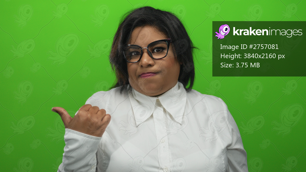 Woman gesturing with thumb to side against vibrant green backdrop wearing glasses and white shirt indicating surprise with facial expression